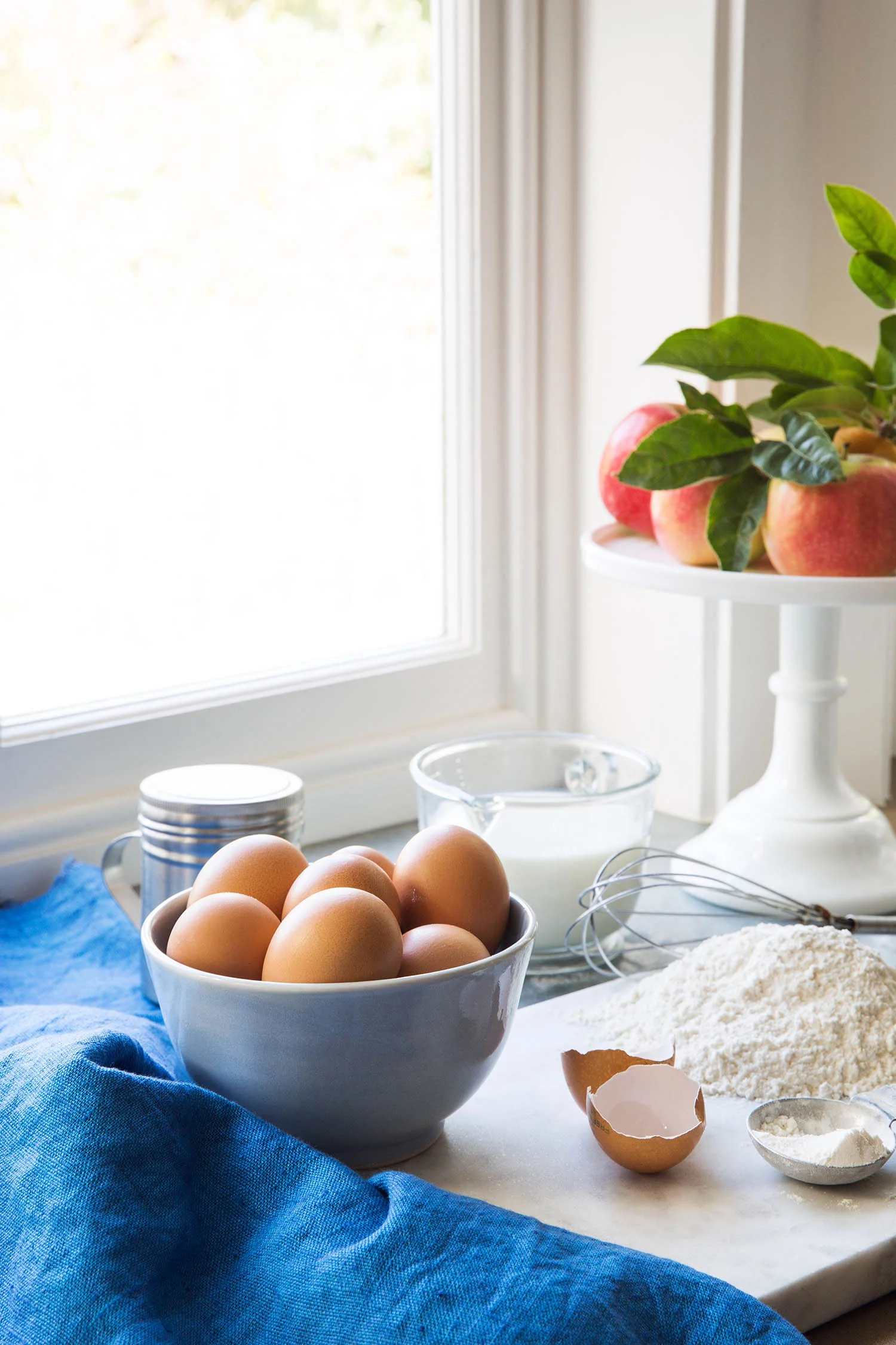 In a large bowl whisk together the flour, sugar, baking powder, salt and cinnamon. You can sift it if you wish but whisking it also removes lumps and adds air to the batter.